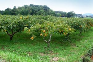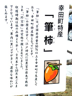 ■特産品:筆柿 当道の駅では「筆柿の里・幸田」の名前の通り、幸田町の特産品であり全国の95%が生産されている 『筆柿』の果樹園に囲まれた施設です。 秋には一面の筆柿景色を目にすることができ、 また加工品の開発により1年を通じ筆柿を味わうことができます。 |